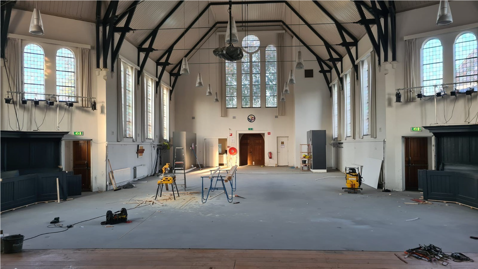 In 2024 is er veel gebeurd in De Spreng. Naast alle concerten, lezingen, culturele avonden, filmavonden en maaltijden was het grootste project dit jaar de vernieuwing van de vloer van de kerkzaal. De hele zomer was de grote zaal leeg gepland, daar moest het gaan gebeuren.